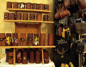 All flasks and mugs are boiled in a beeswax and paraffin solution to impregnate the leather and wood with antimicrobial and water resistant properties. The interiors are coated with a food grade resin so they can handle hot, cold, and alcoholic beverages. Small mugs hold two cups, large mugs hold four, small flasks hold two cups, medium four cups, large six cups (1.4 liters). Mugs have a wood base so heat transfer doesn't burn your hands. Hand wash.